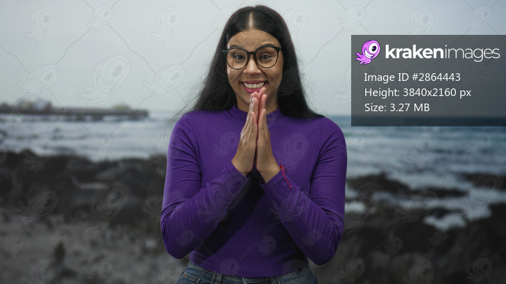 Woman in purple top presses hands together on rocky seaside shoreline with closed eyes and smiling; serenity.