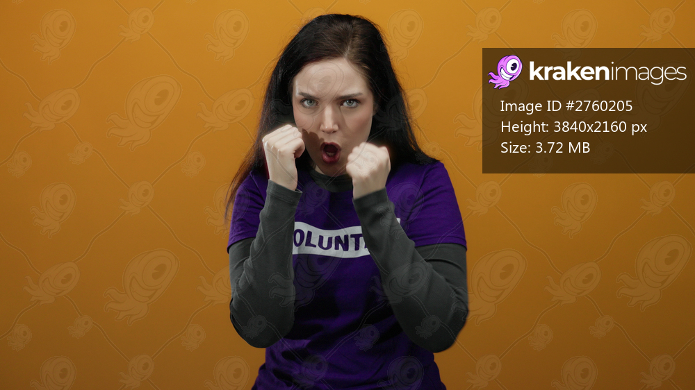 Woman in purple volunteer shirt posing with fists raised against orange background showing determination.