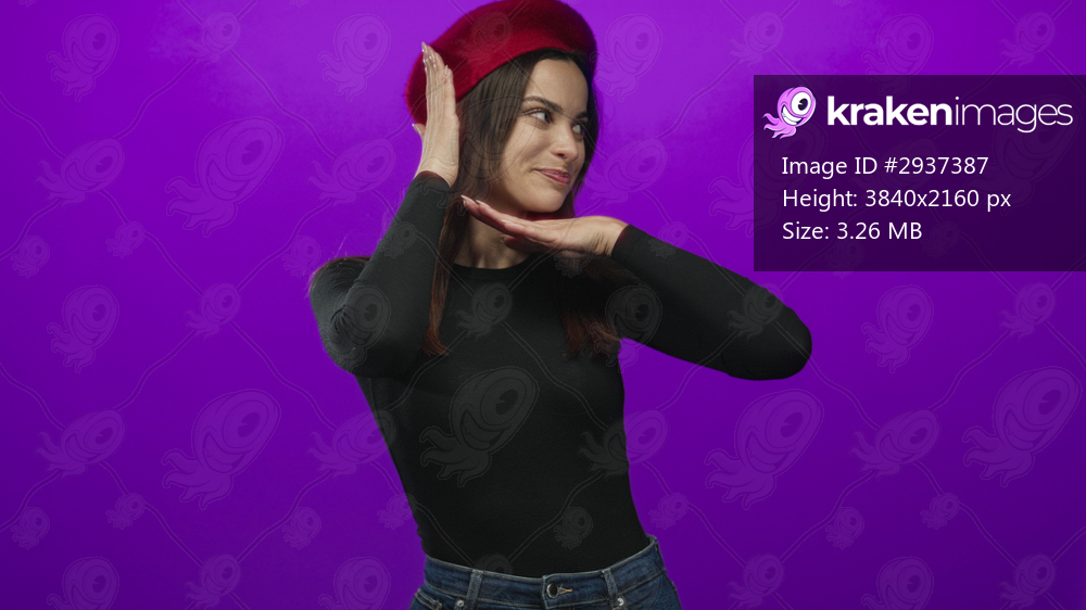 Woman in red beret framing her face with hand to ear and hand under chin in purple studio wall; playful.