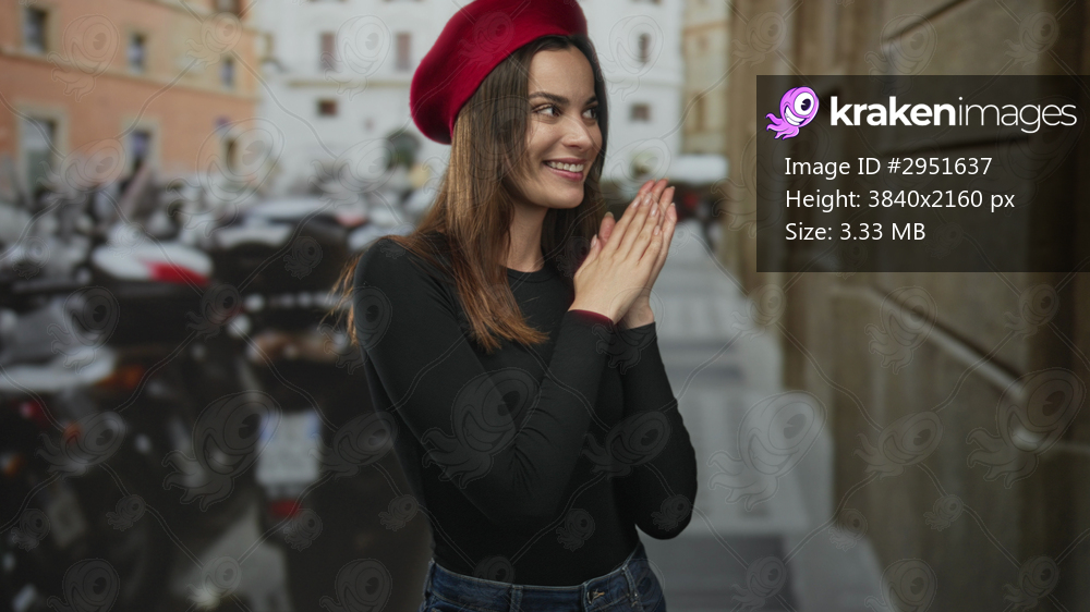 Woman in red beret with hands clasped near face smiling, wearing black top and jeans on a narrow city street beside stone building and parked scooters; joy travel. - Kraken Images