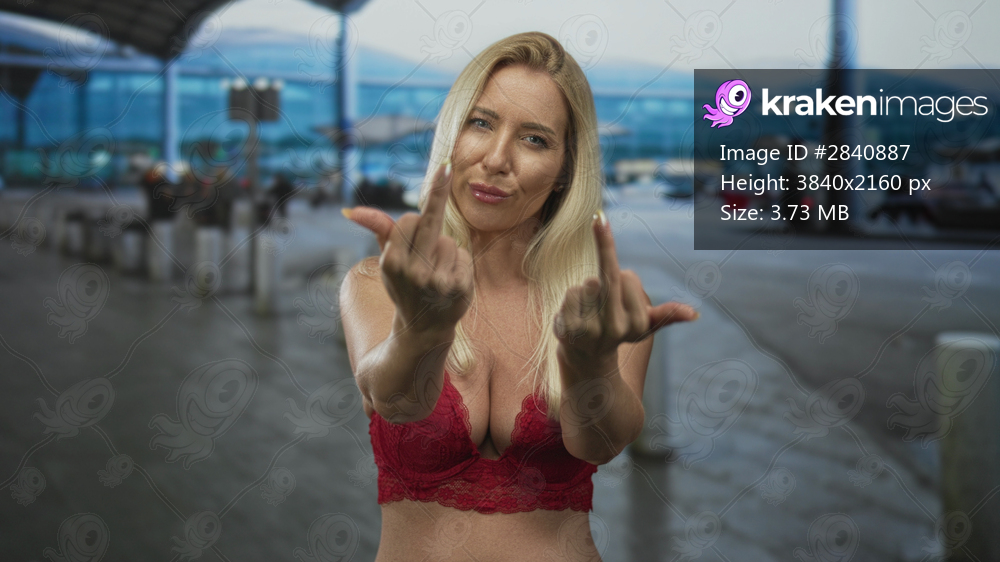 Woman in red bra flips middle finger at airport terminal outdoors under canopy with departure area behind her; defiance boldness.