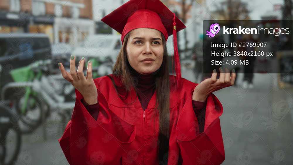 Woman in red cap and gown standing outdoors on a busy street with a thoughtful expression in a graduation scene, capturing the essence of achievement and contemplation. - Kraken Images