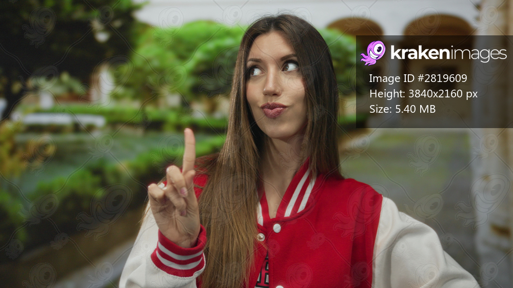 Woman in red cheerleader uniform points index finger outside an old university building; skepticism.