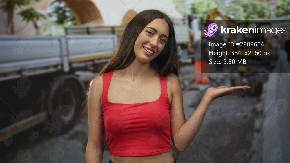 Woman in red crop top with bare shoulder holding open palm to present, smiling, standing at a street construction site with workers and truck visible; confidence. - Kraken Images