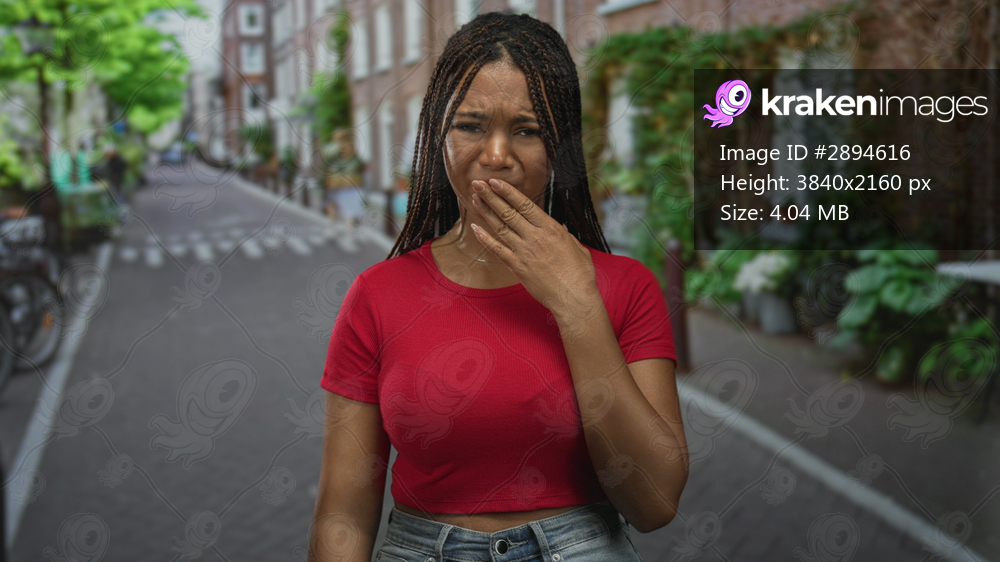 Woman in red crop top with hand to mouth for nausea on city street with brick houses and bicycles; disgust nausea.