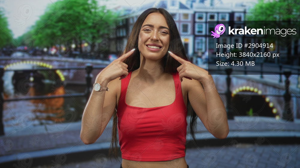 Woman in red crop top points finger to cheeks on amsterdam street, smiling with exposed stomach; youthful joy.