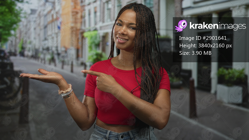 Woman in red crop top points index finger to open left palm on cobblestone city street lined with canal houses and bollards; confidence.