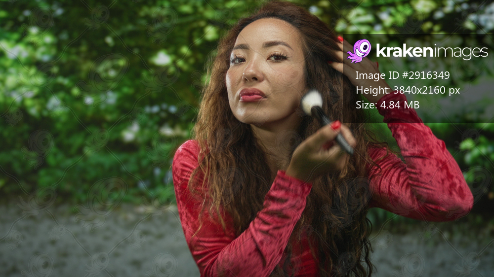 Woman in red dress applying makeup with brush to face in forest park, adjusting hair; self care confidence.