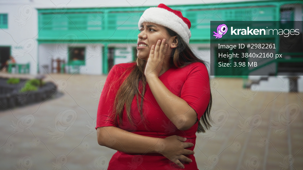Woman in red dress and santa hat clutching stomach with hand to cheek, wincing outside a green building; holiday pain.