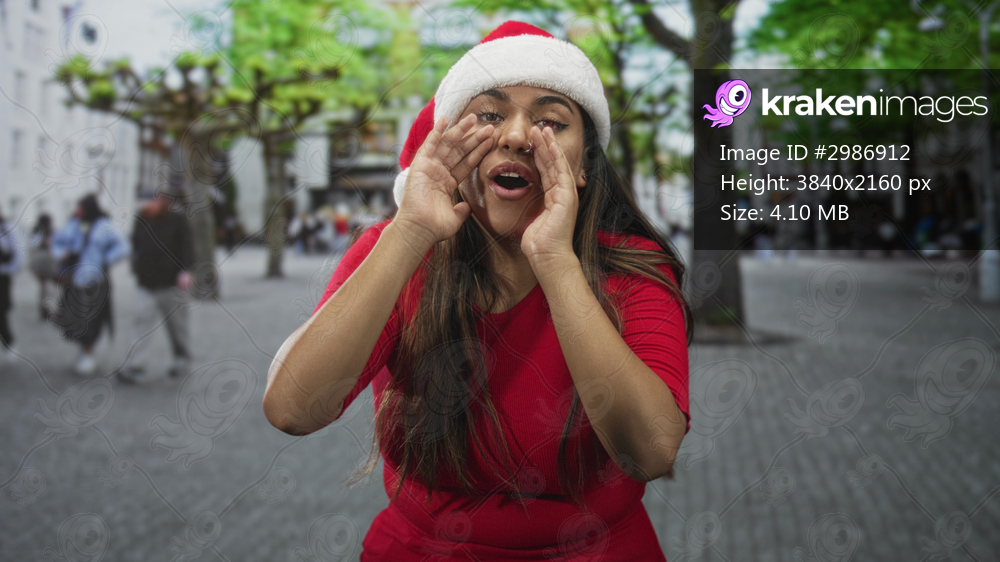 Woman in red dress and santa hat cups hands to mouth calling out, then claps and smiles in a pedestrian city street lined with trees and buildings; holiday joy. - Kraken Images