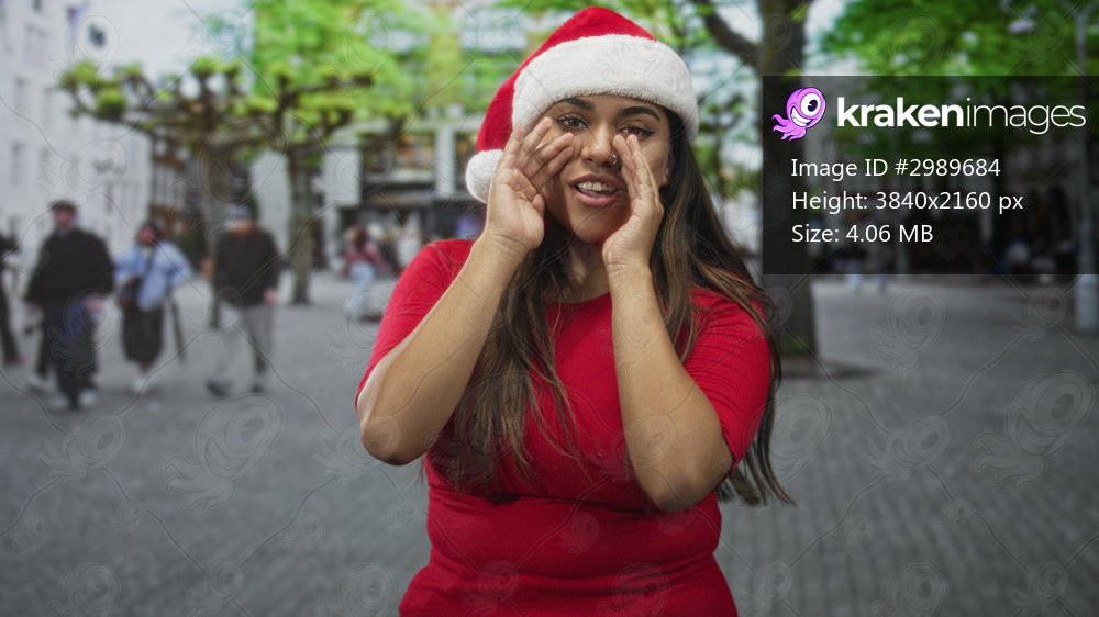 Woman in red dress and santa hat cups hands to mouth calling out, then claps and smiles in a pedestrian city street lined with trees and buildings; holiday joy. - Kraken Images