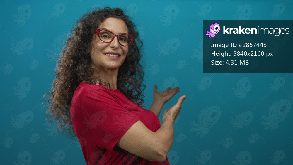 Woman in red glasses and shirt presenting with open hands and bare arms against a blue wall in studio; confidence.