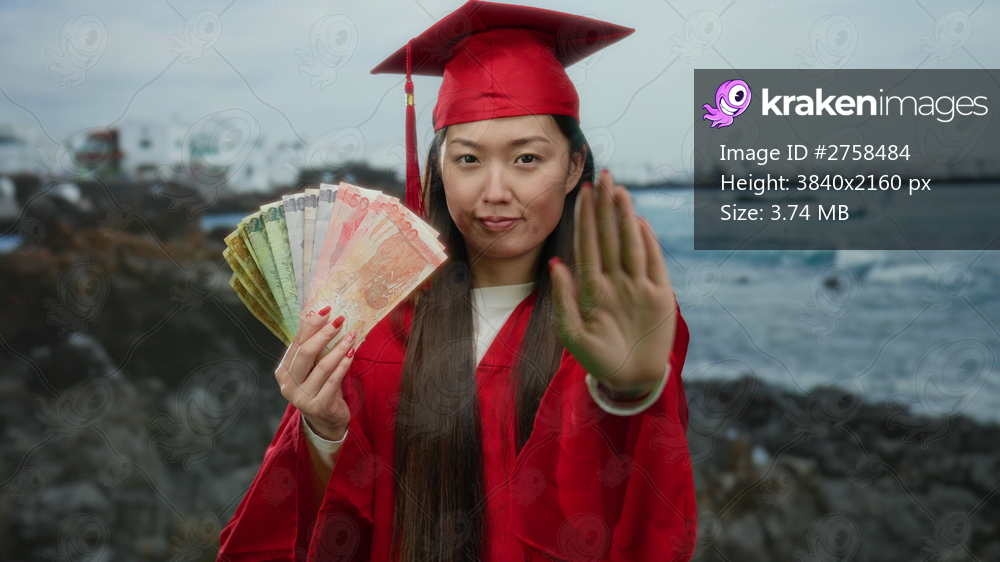 Woman in red graduation attire holding philippine peso banknotes near seaside with a serious gesture outdoors.