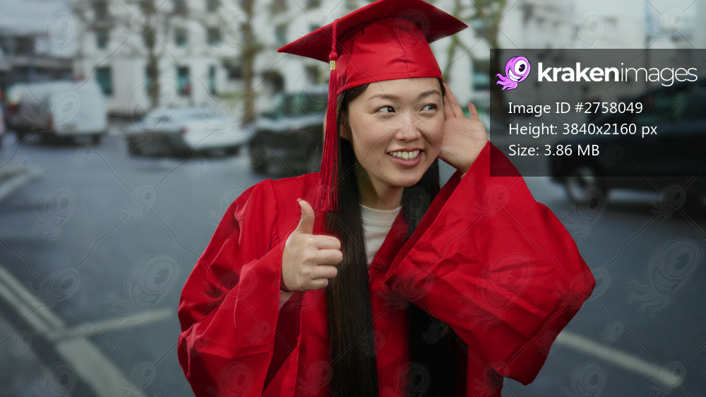 Woman in red graduation attire smiling and giving thumbs up on city street, gesturing with hand to ear, celebrating achievement outdoors.