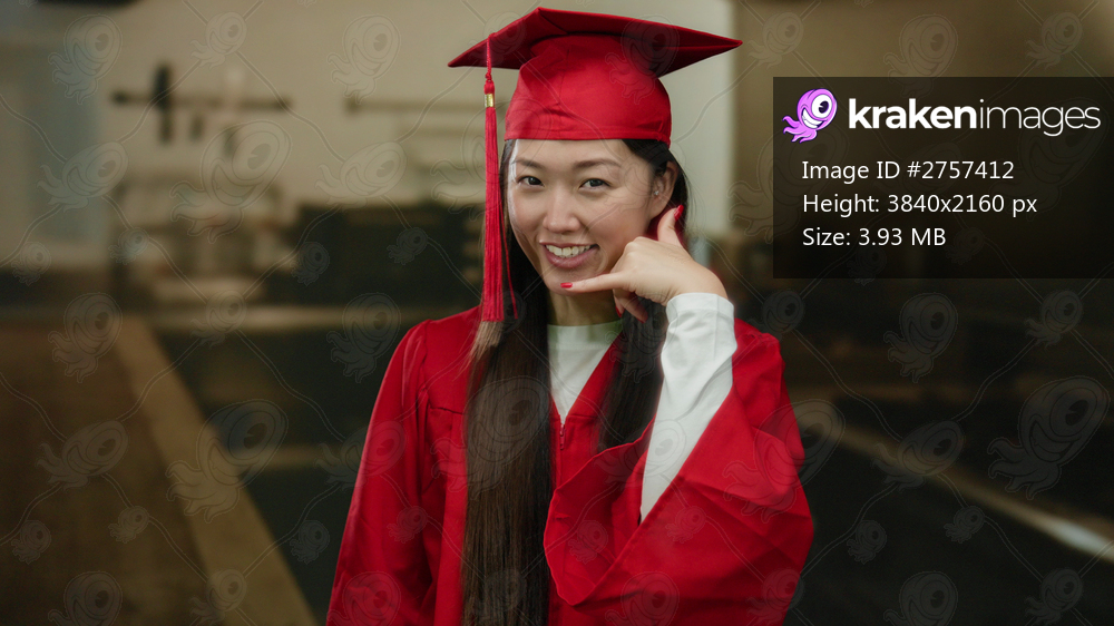 Woman in red graduation attire stands smiling in a kitchen making a phone gesture, embodying achievement in an indoor setting.