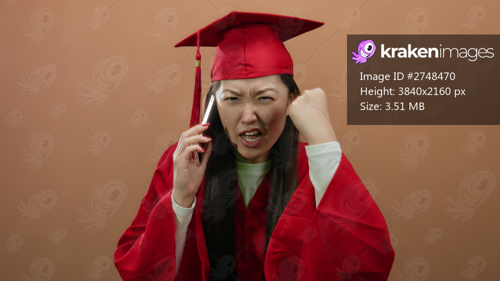 Woman in red graduation gown angrily talking on phone against a brown wall, displaying determination and youth.