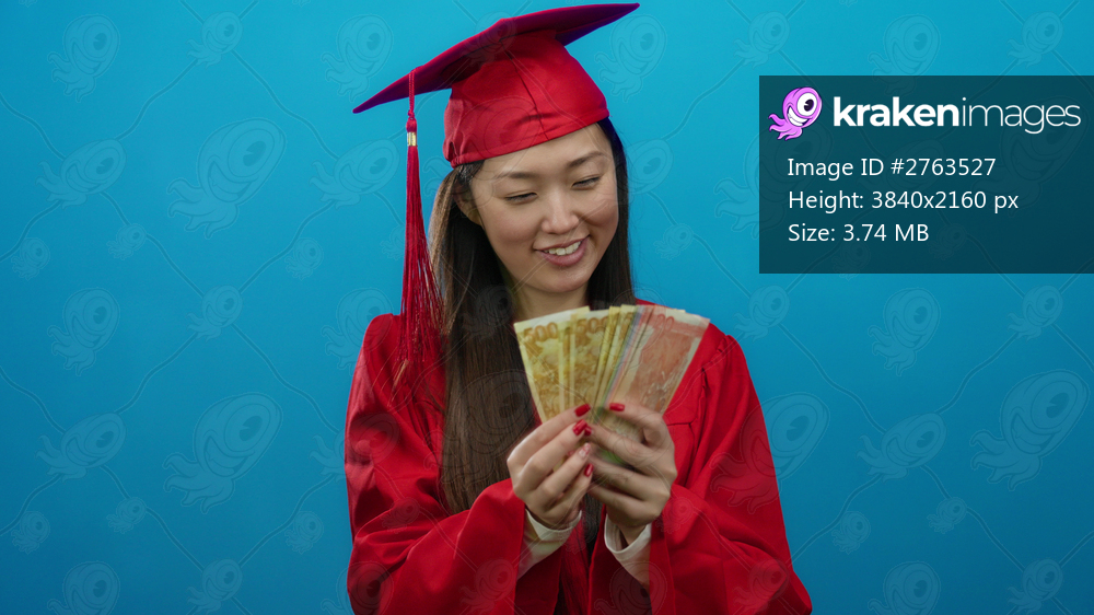 Woman in red graduation gown counting philippine pesos against isolated blue background.