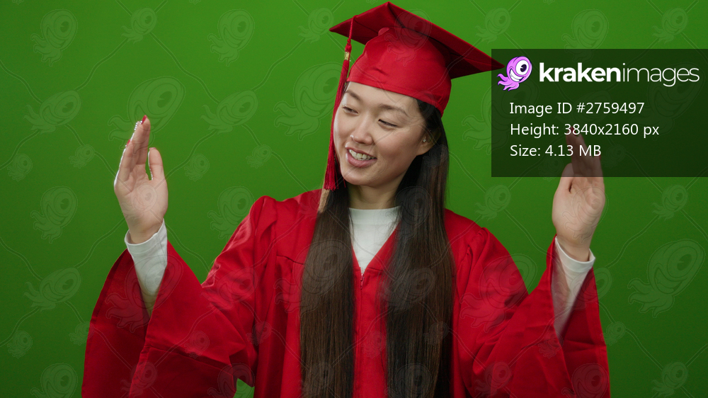 Woman in red graduation gown gestures happily against isolated green wall with long dark hair and a tassel cap, symbolizing academic achievement and cultural pride. - Kraken Images