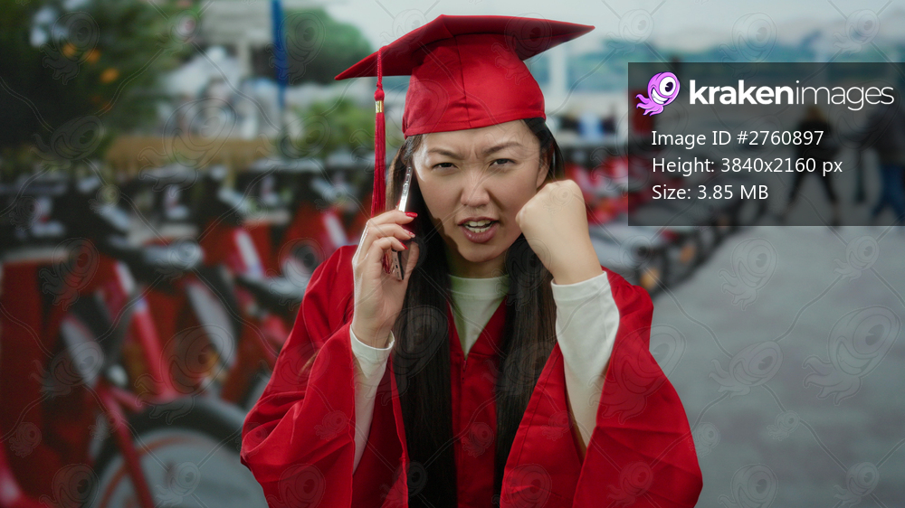 Woman in red graduation gown gesturing angrily while talking on phone in urban street with bikes in background.