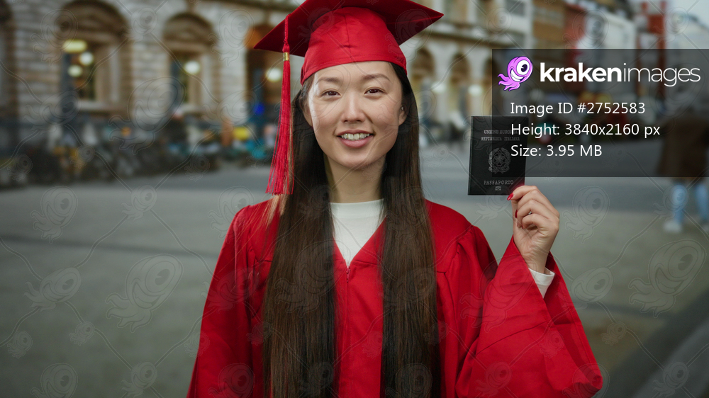 Woman in red graduation gown holding italian passport on city street