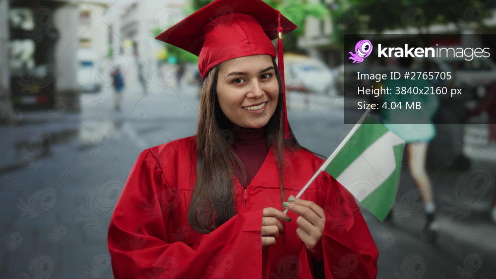 Woman in red graduation gown holds nigerian flag smiling on outdoor street background symbolizing achievement celebration education and patriotism.