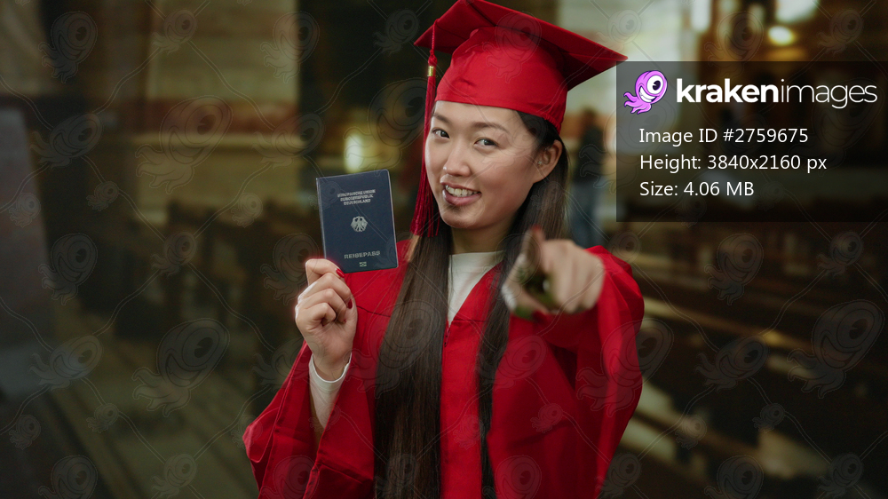 Woman in red graduation gown indoors holding german passport in a church setting, smiling confidently and pointing forward, representing multicultural achievement and identity. - Kraken Images