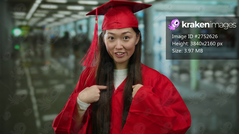 Woman in red graduation gown smiling in an indoor setting, symbolizing achievement and joy in education and graduation, surrounded by people in a busy environment. - Kraken Images
