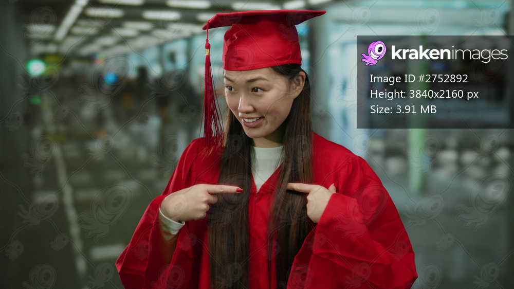 Woman in red graduation gown smiling in an indoor setting, symbolizing achievement and joy in education and graduation, surrounded by people in a busy environment. - Kraken Images