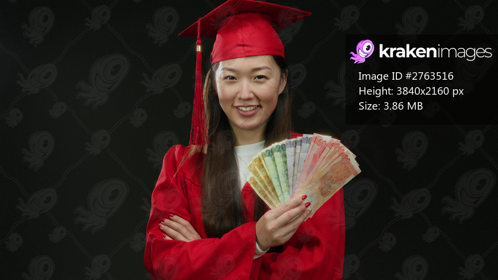 Woman in red graduation gown smiling while holding philippine peso banknotes, posing over an isolated black background.