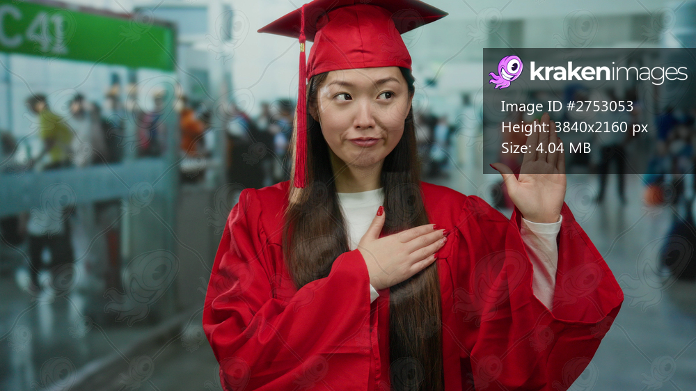 Woman in red graduation gown taking oath at busy airport terminal surrounded by people and gate signs blending academic and travel themes beautifully.