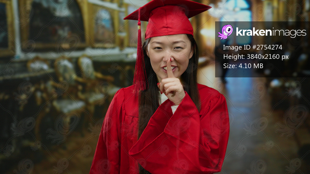 Woman in red graduation robe inside museum points to lips, symbolizing silence and education in an elegant art gallery.