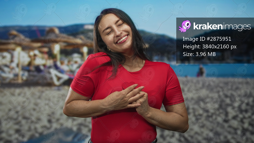 Woman in red holds a small red paper heart at a sunny pebble beach while smiling and clasping it with both hands; love happiness connection.