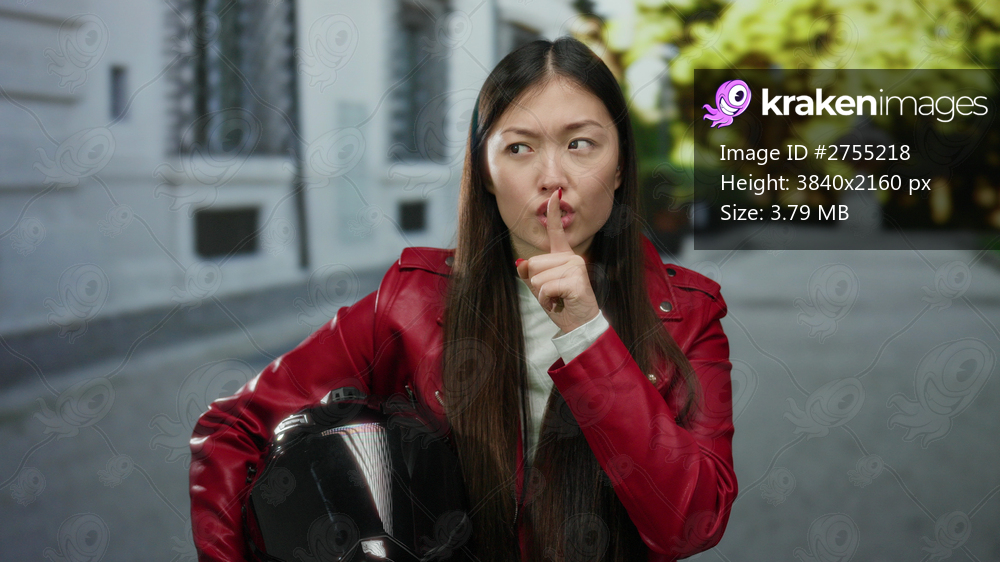 Woman in red jacket holding helmet on urban street, making hush gesture with finger to lips, embodying silence and secrecy in a city setting.