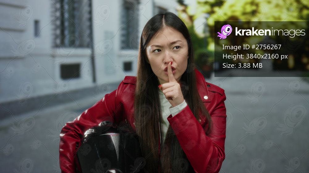 Woman in red jacket holding helmet on urban street, making hush gesture with finger to lips, embodying silence and secrecy in a city setting.