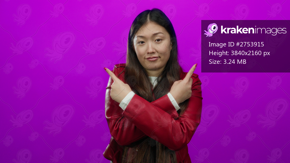 Woman in red jacket with long hair gestures against bright pink background conveying playful confusion and direction pointing.