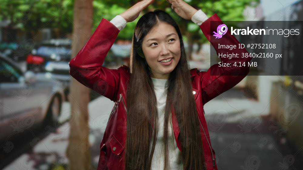 Woman in red jacket on urban street performing playful gesture outdoors showing contemporary fashion confidence