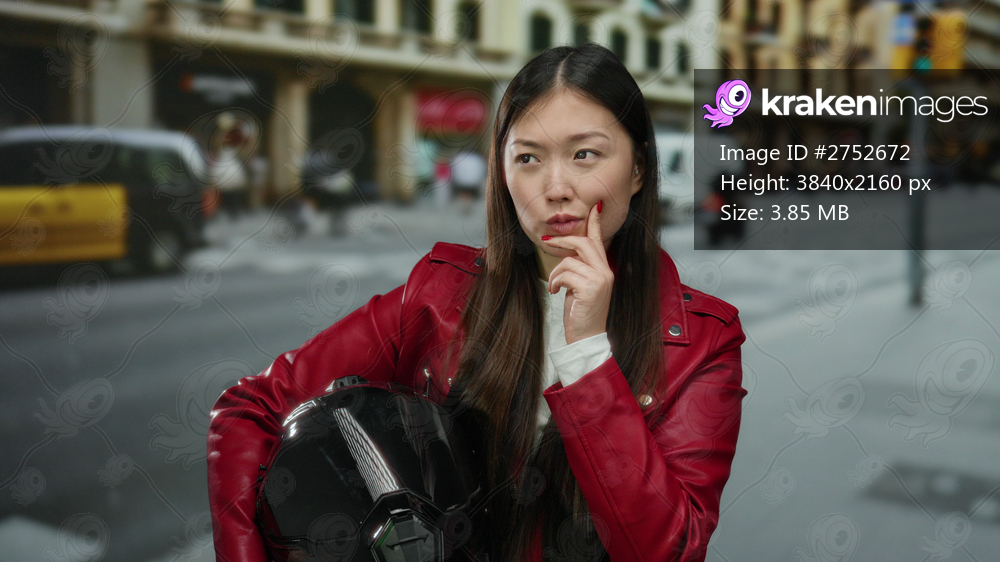 Woman in red jacket ponders on bustling city street holding helmet showcasing urban lifestyle and thoughtful expression in a vibrant outdoor scene.