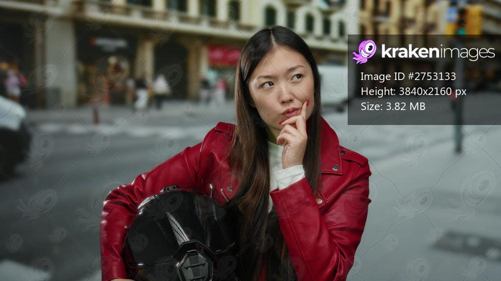 Woman in red jacket ponders on bustling city street holding helmet showcasing urban lifestyle and thoughtful expression in a vibrant outdoor scene.