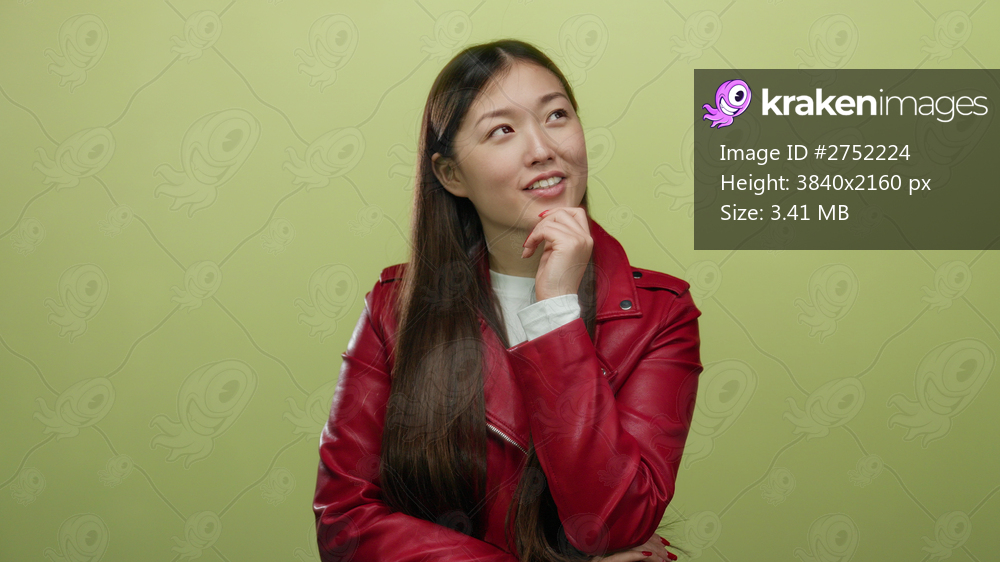 Woman in red jacket posing against isolated yellow background, depicting a thoughtful expression enhanced by long hair and pierced ears.