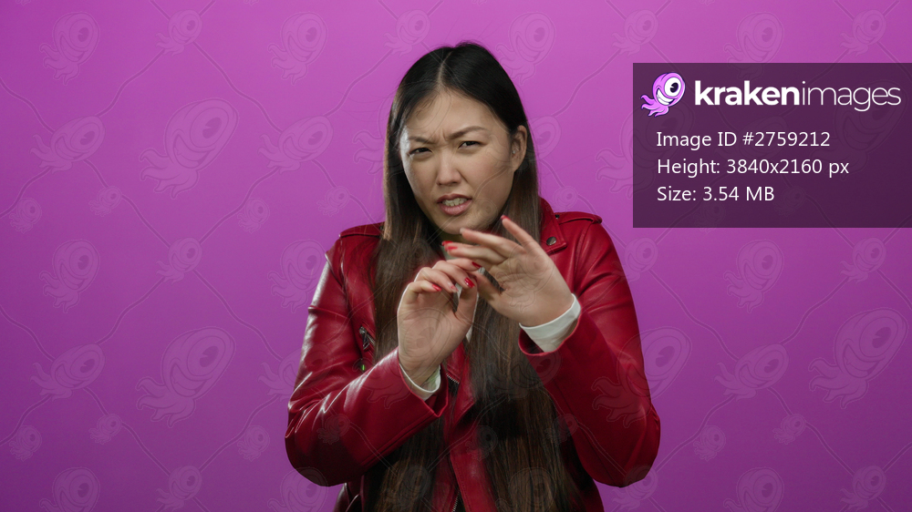 Woman in red jacket showing disgust against an isolated pink background, expressing strong aversion.