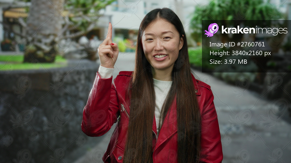 Woman in red jacket smiling on an urban street during daytime, showcasing a cheerful expression with trees and buildings in the background.