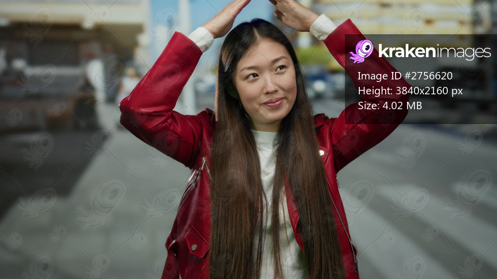Woman in red jacket smiling and posing playfully on a city street, showcasing urban fashion and lively outdoor atmosphere.
