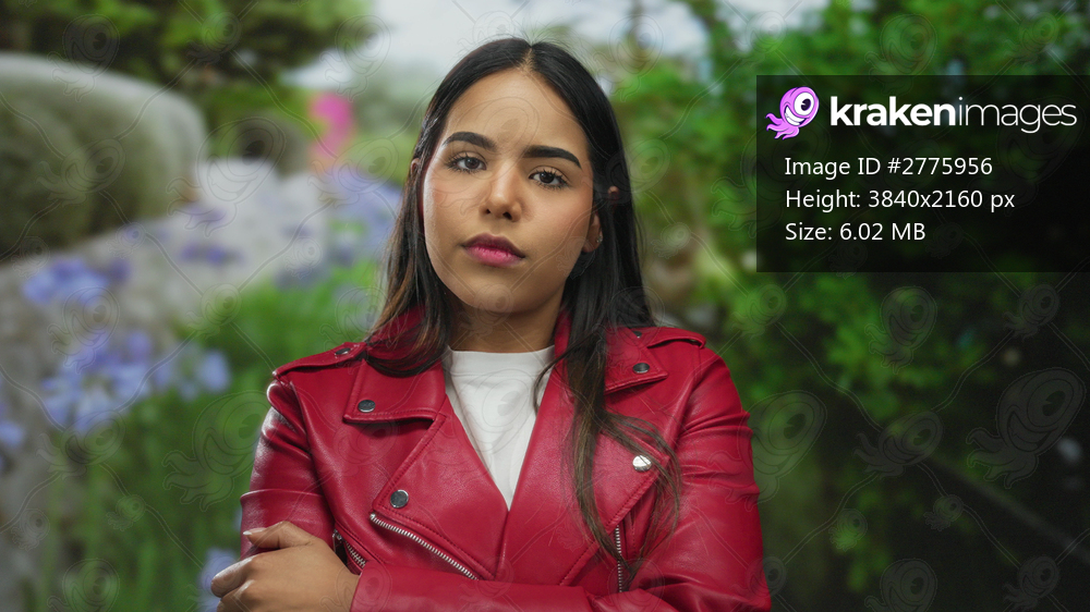 Woman in red jacket standing in a green park with trees and flowers surrounding her creating a natural and vibrant outdoor setting