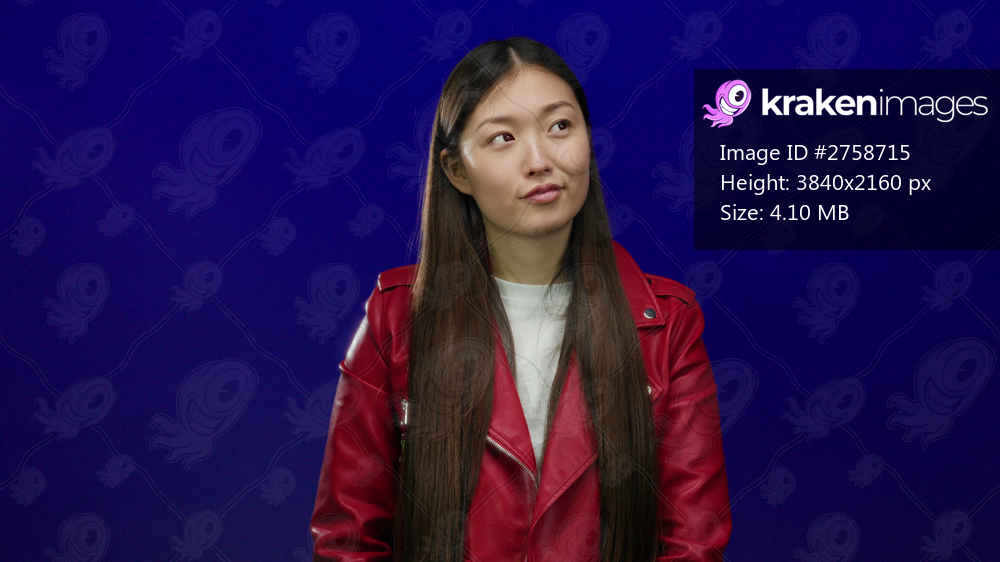 Woman in red jacket stands against an isolated blue background, featuring young attractive asian female looking sideways, with long hair and casual attire. - Kraken Images