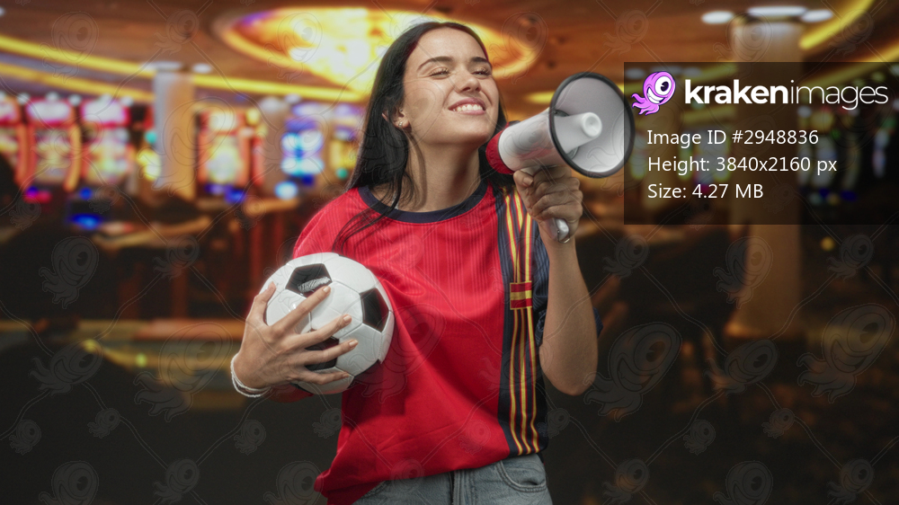Woman in red jersey holding soccer ball shouts into megaphone inside building with casino slot machines visible; excitement.
