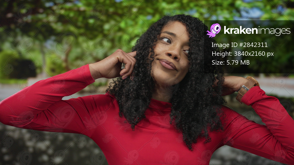 Woman in red long sleeve shirt covers her ears with both hands in a sunlit green park pathway; annoyance.