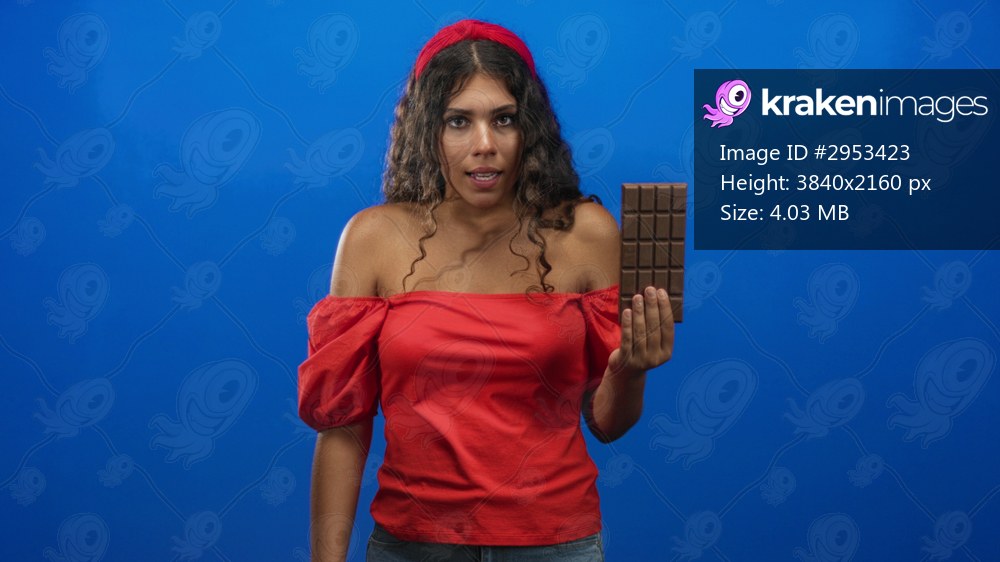 Woman in red off shoulder top holds chocolate bar with bare shoulder visible and hand extended in studio; curiosity temptation indulgence.