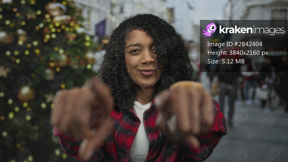 Woman in red plaid shirt points finger at camera on busy city street by christmas tree; friendly invitation.
