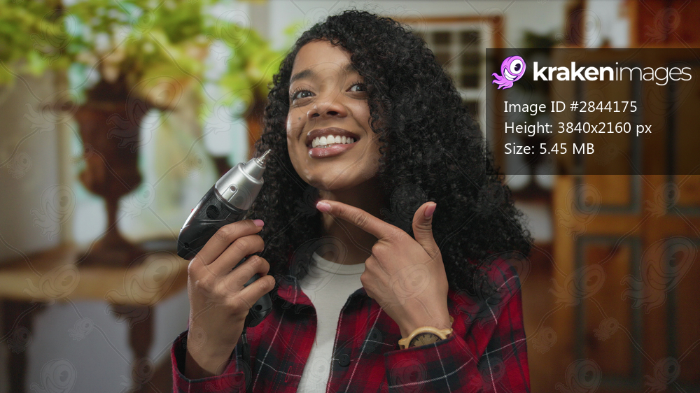 Woman in red plaid shirt points finger to electric drill in studio; diy empowerment confidence creativity.