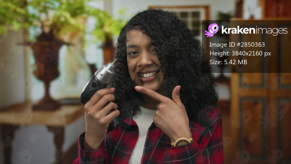 Woman in red plaid shirt points finger to electric drill in studio; diy empowerment confidence creativity.